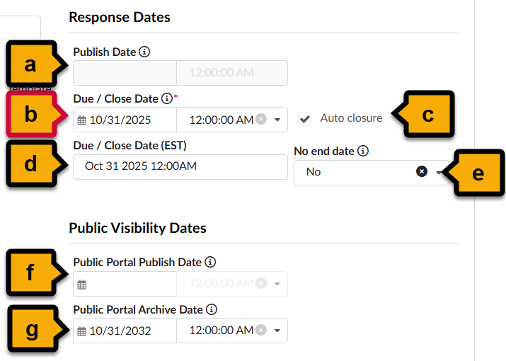 - Enter information in the fields for the Response Dates and Public Visibility sections on the right side of the form. A red asterisk (*) indicates a required field.