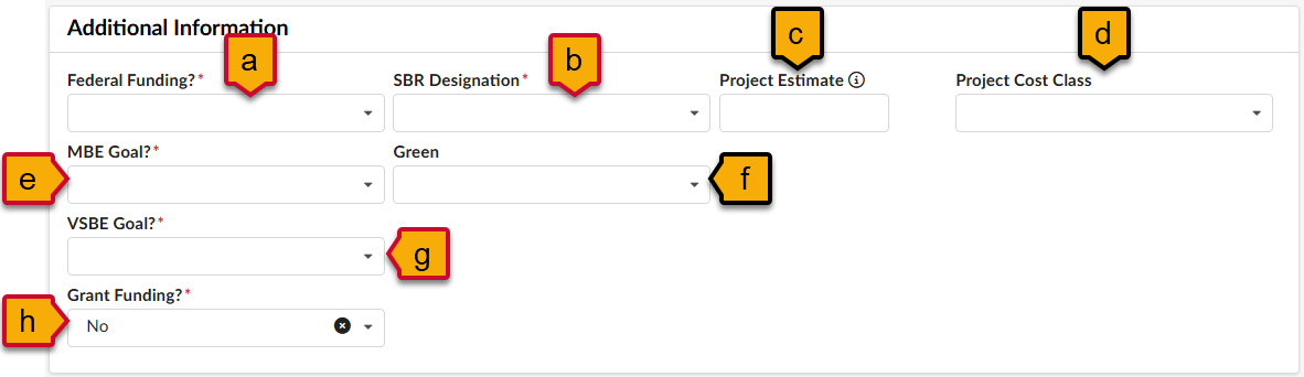 - MBE Goal? (*): Does your project have a Minority-Owned Business Enterprise (MBE) goal? Click this field and select Yes or No.