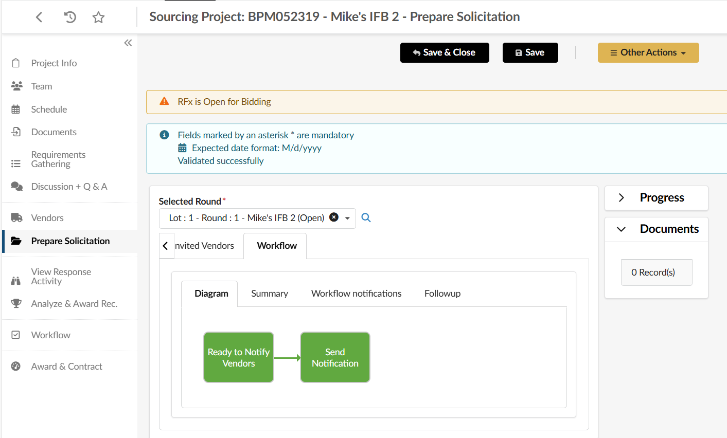 The Workflow subtab in the Prepare Solicitation tab shows that your message has been sent to your vendors.