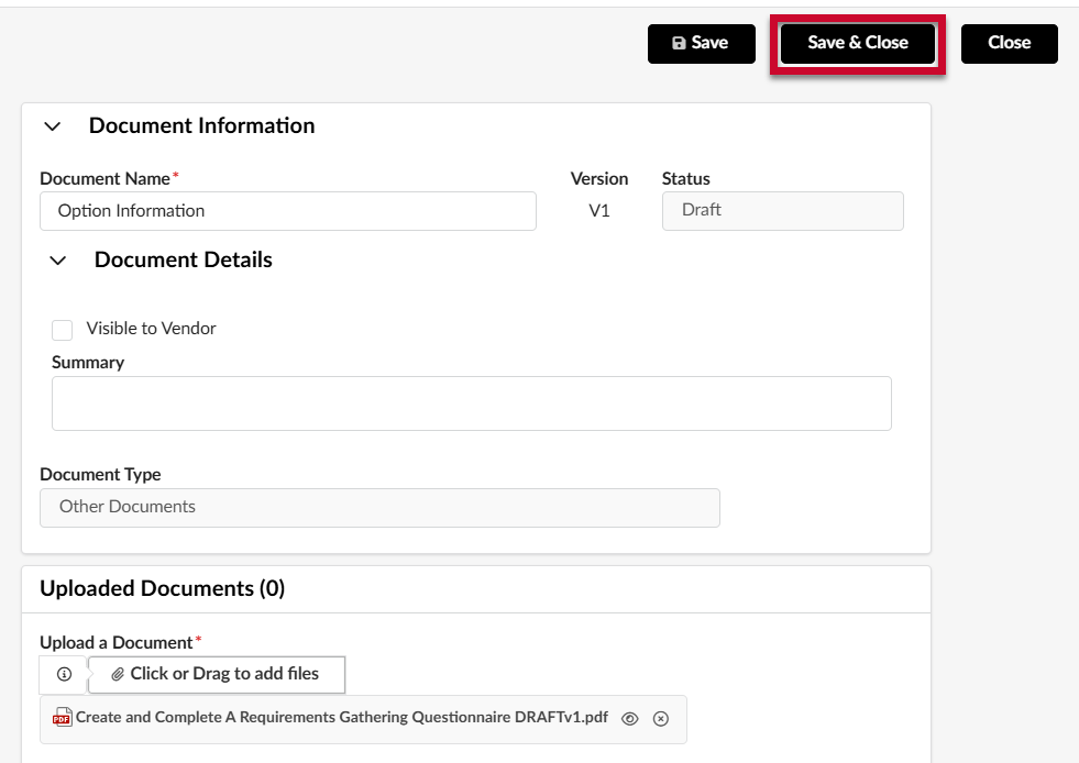 - In the Document window, enter the information required in the fields provided, upload the new document, and click the Save & Close button at the top of the Document window.