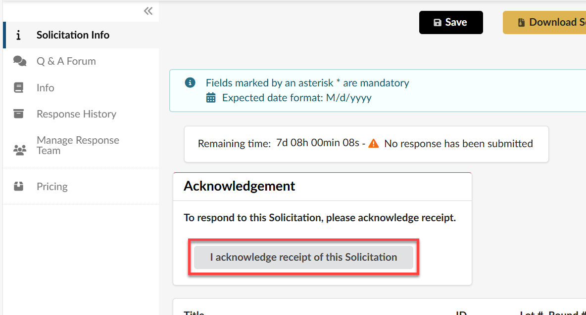 - Click the I acknowledge receipt of this Solicitation button.