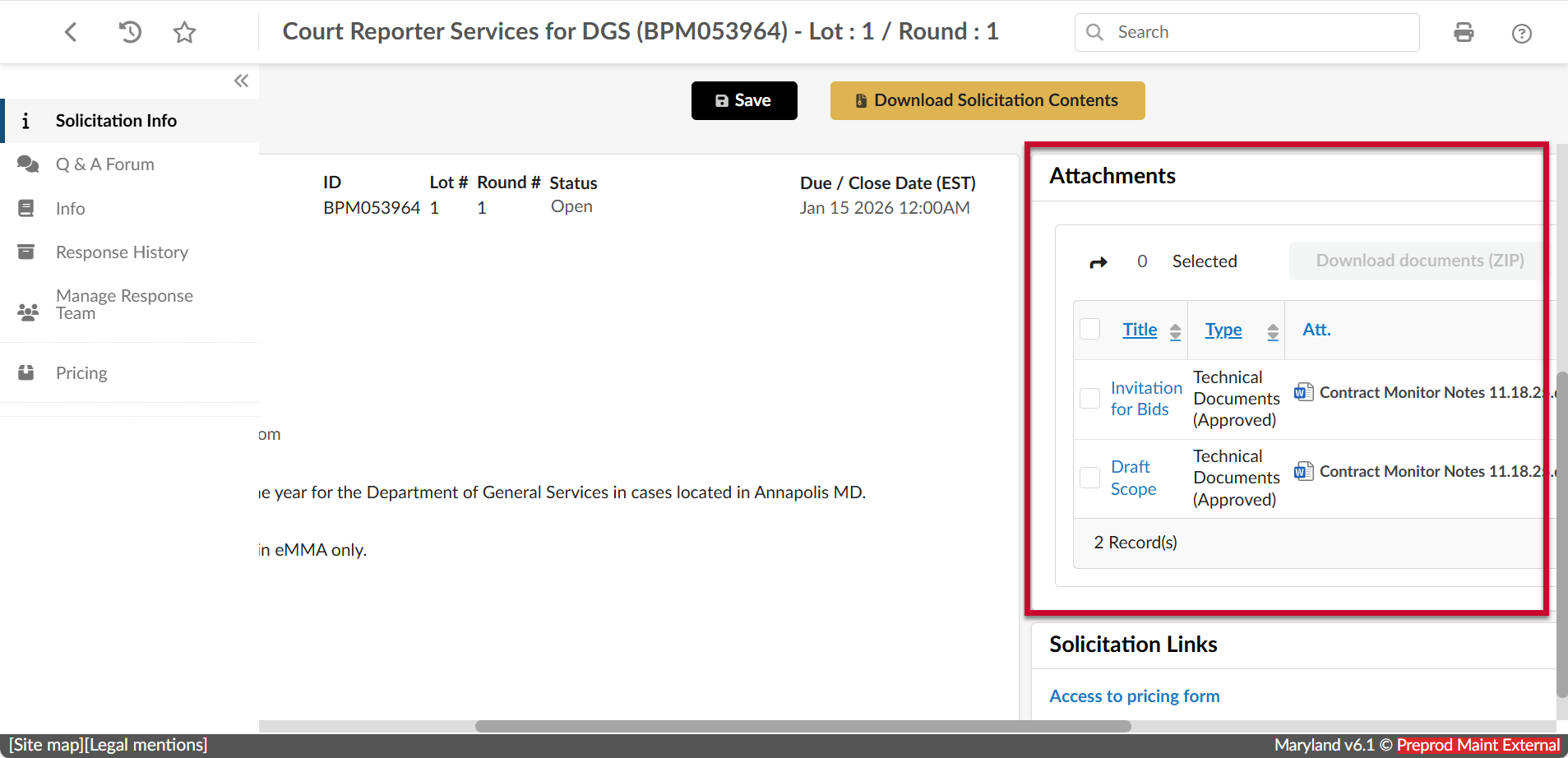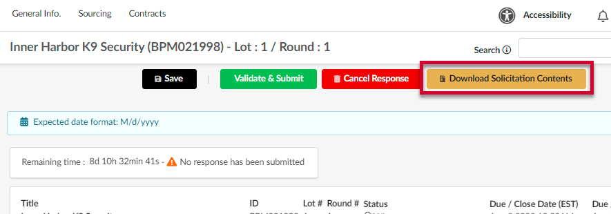 - Click the Download Solicitation Contents button at the top to download a zip file of the solicitation attachments.