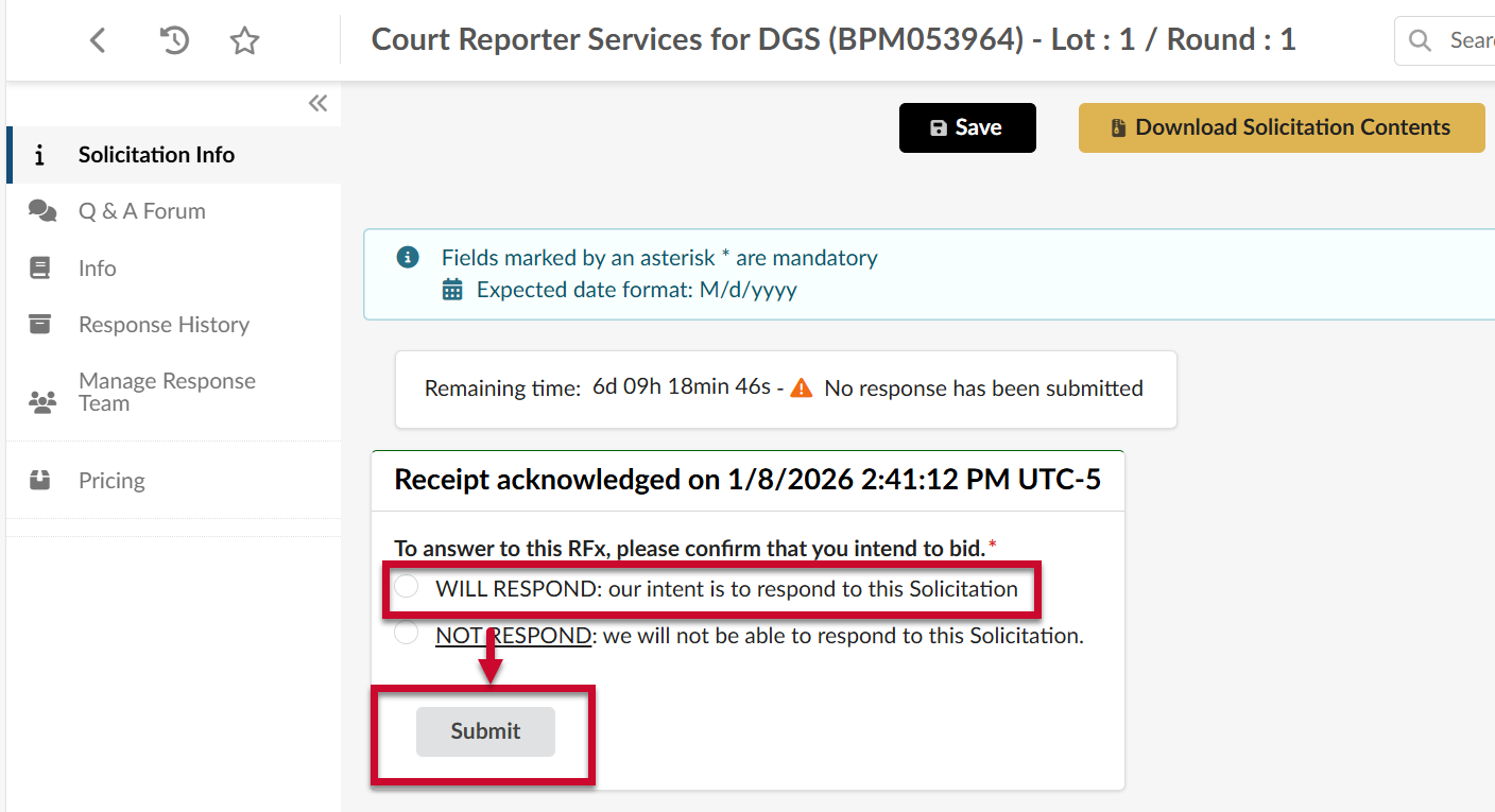 - Scroll to the top and click the radio button WILL RESPOND: our intent is to respond to this Solicitation, then click the Submit button.
