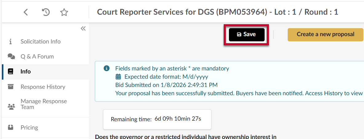 - A popup displays asking, Do you really to want to submit your bid/proposal response? Review the attachments and items filled Click the Yes, Submit button to submit your response. A banner shows at the top of the page to confirm submission and a timestamp.