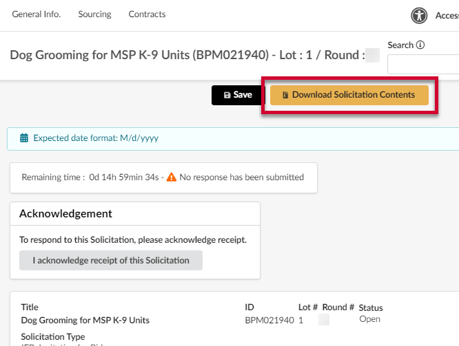 - (Optional) Click the Download Solicitation Contents button at the top of the screen. This downloads a zip folder to your computer containing attachments from the solicitation.