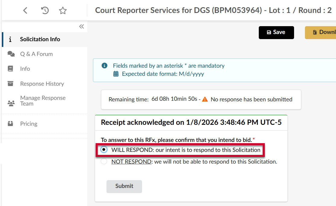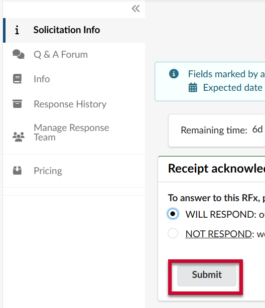 - Click the I acknowledge receipt of this solicitation button on any tab in the side-panel. The screen displays the date and time when you acknowledged receipt of the solicitation.
