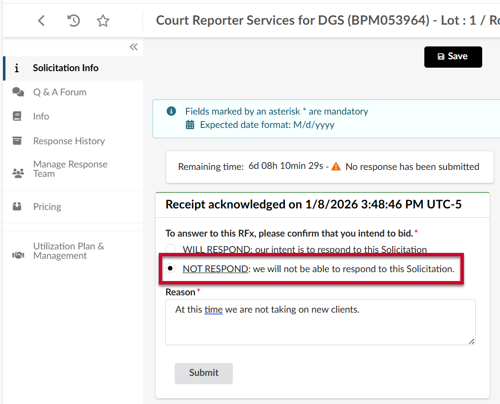 NOTE: If you opted not to respond to this solicitation, a mandatory field displays. Enter the reason why you will not respond to the solicitation amendment.