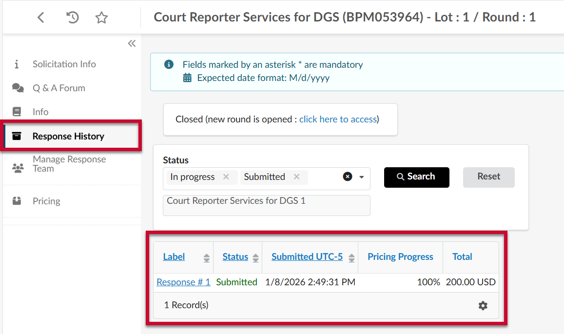 For instructions for viewing prior round submissions from your Vendor profile, see this section of this QRG How to View Previous Bid Submissions.