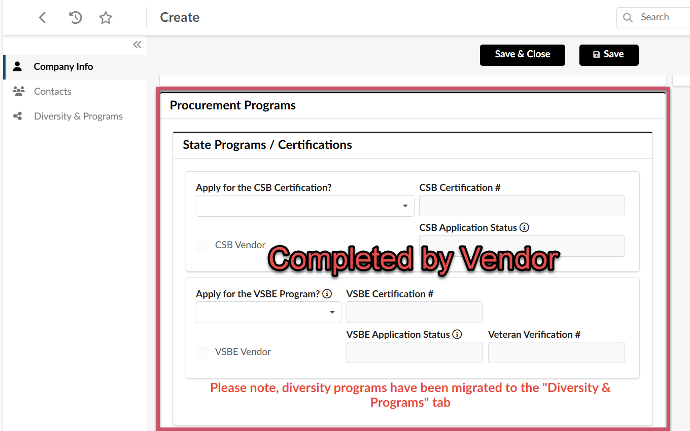 - Skip the fields in the Procurement Programs section. These fields are for the Vendor to complete.