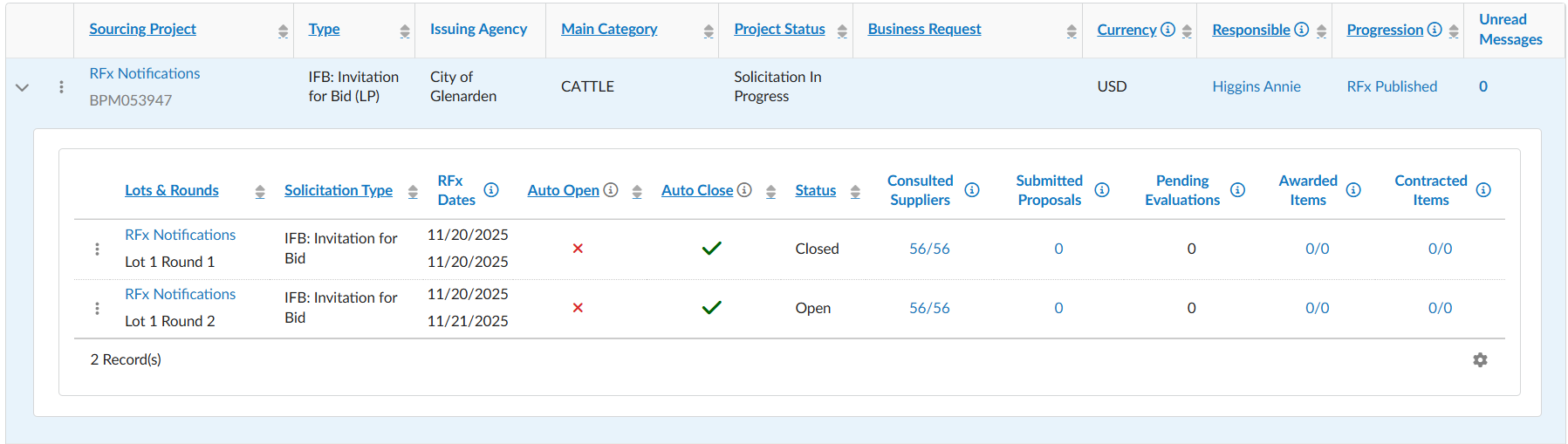 PRO TIP: You can also view all of the individual lots and rounds associated with a sourcing project by clicking on the arrow icon at the left of the table.
