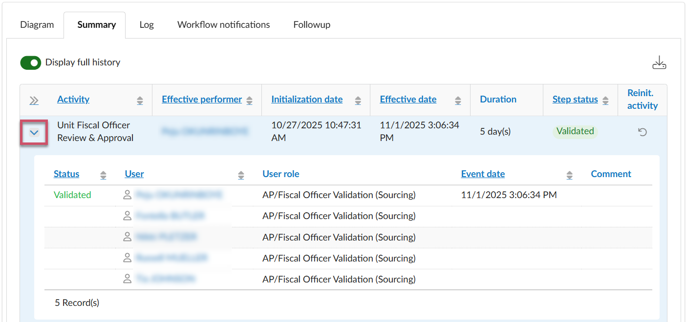 To view the complete list of users capable of completing that workflow step, click the Arrow icon to the left of the Activity column to expand it.