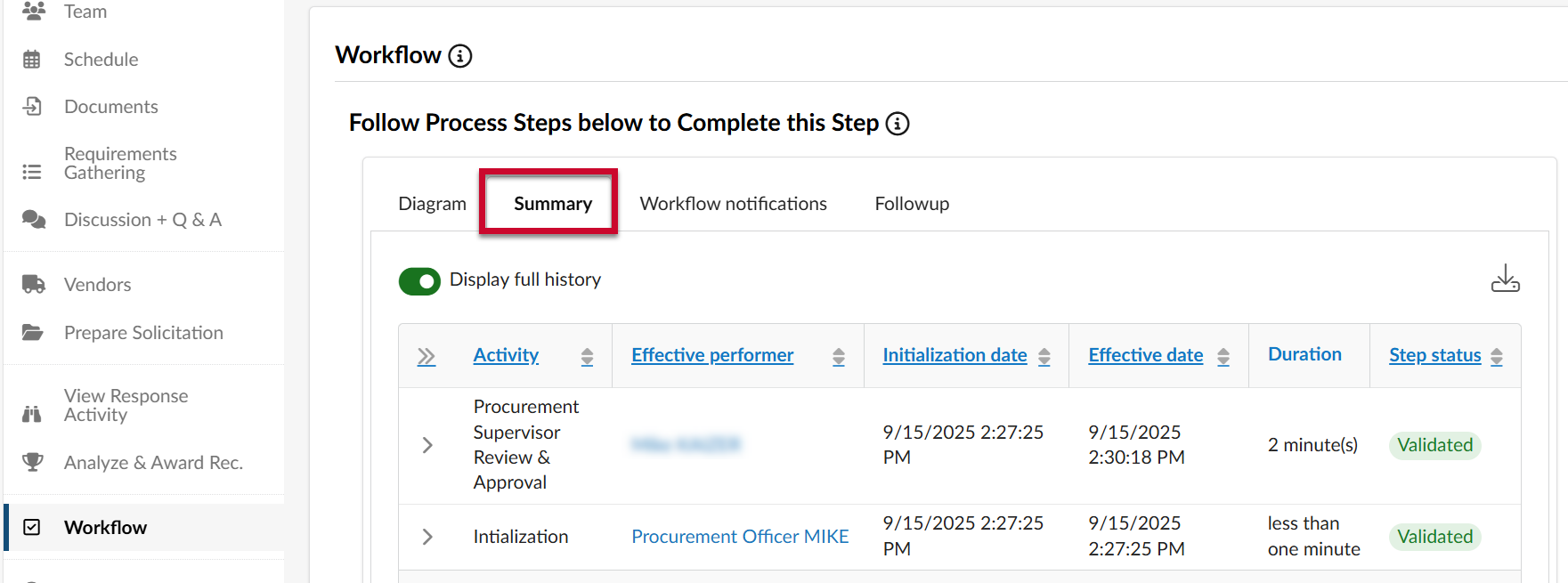 PRO TIP: The Summary and Workflow Notifications horizontal tabs within the workflow tab can be very useful for viewing approval steps (approved, rejected, pending), and what messages were sent and when.