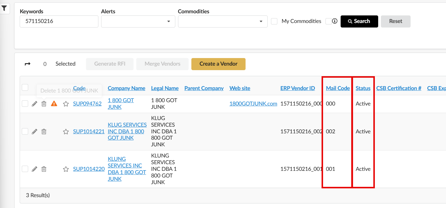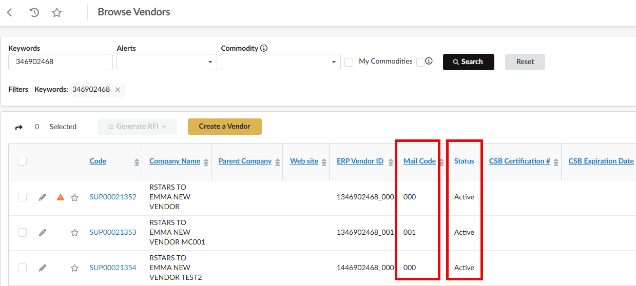- The Mail Code column shows which Vendor is the parent record (with mail code 000) and which are the child records (with mail codes 001 and above).
