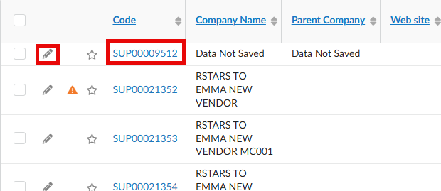 - Click the appropriate Edit (pencil) icon or the code link to view the Vendor profile.