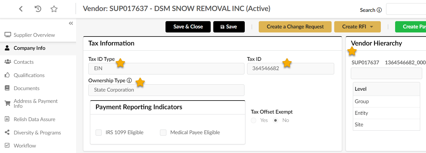 • On the Vendor record, click the Company Info tab on the left-hand side-panel. Information such as the Vendor’s legal name, status, business description, web address, and other information is displayed.