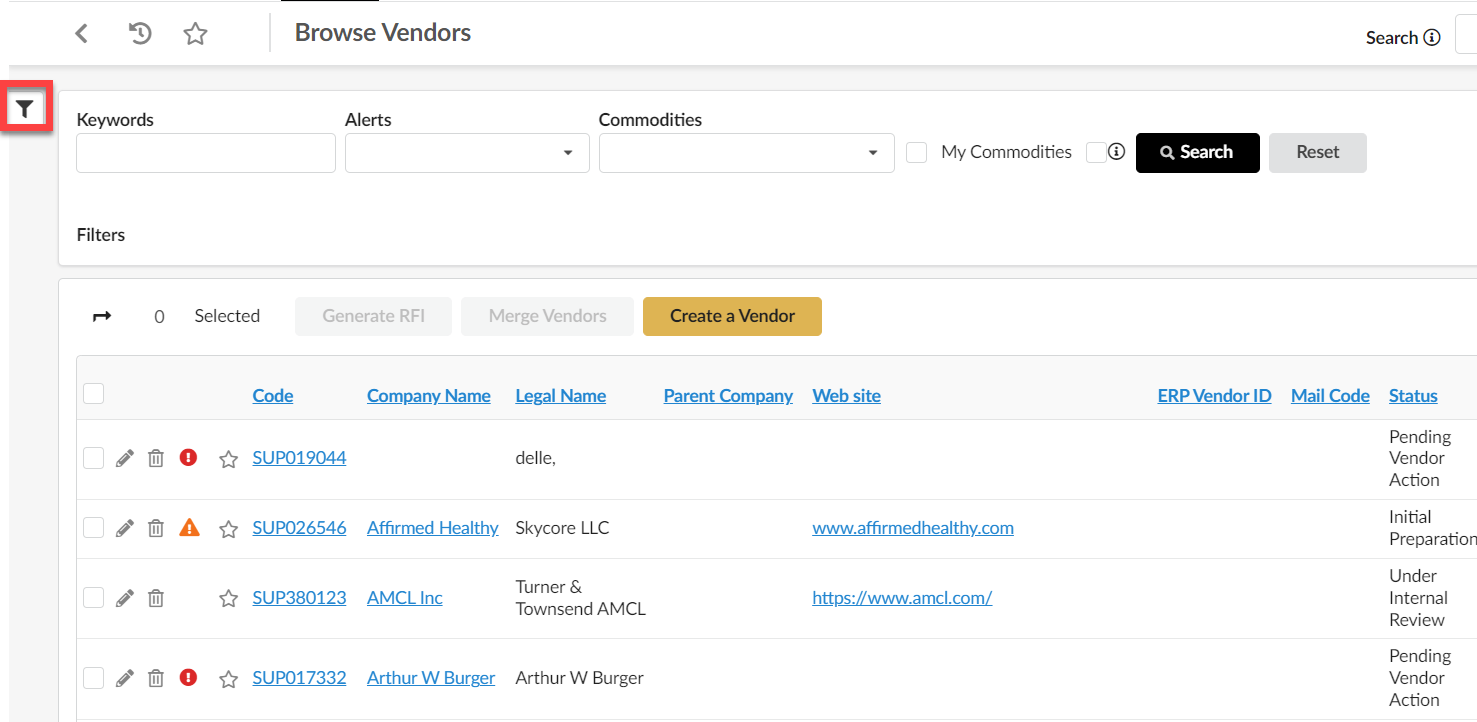 6. To search specifically for Vendors with one or more NAICS classifications, navigate to the Browse Vendors page and click the filter (funnel) icon in the upper left corner of the page to open the side-panel.