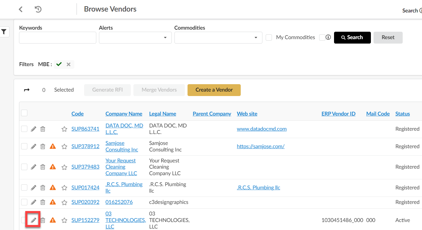 11. Click the Edit (pencil) icon to the left of a Vendor record to access it.