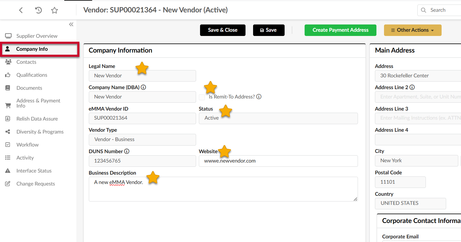 - On the Vendor record, click the Company Info tab on the left-hand side-panel. Information such as the Vendor’s legal name, status, business description, web address, and other information is displayed.