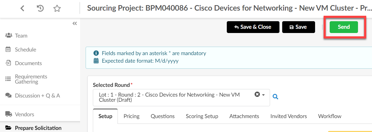 - Click the Send & Close button at the top of the Solicitation window. This notifies the vendors you selected in the Vendor tab. Three prompts display asking for confirmation to notify Vendors and open the Amendment. Click OK in each. This sets up the notification to Vendors regarding the Amendment and changes the Amendment status from Draft to Open.