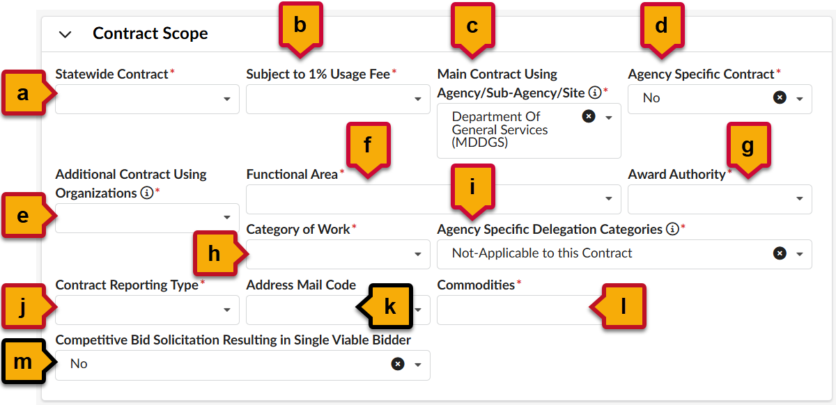 - Enter the information in the fields for the Contract Scope section. A red asterisk (*) indicates a required field.