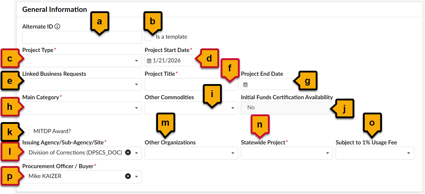 - MBE Goal? (*): Does your project have a Minority-Owned Business Enterprise (MBE) goal? Click this field and select Yes or No.