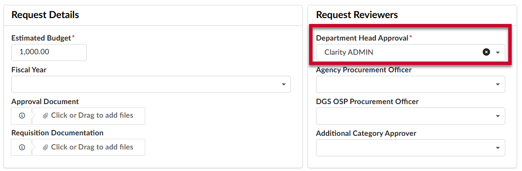 - (Optional) In the Request Reviewers section, type the name of the Agency Procurement Officer who will be supporting the procurement in the Agency Procurement Officer field, then select them from the drop-down menu when they appear.