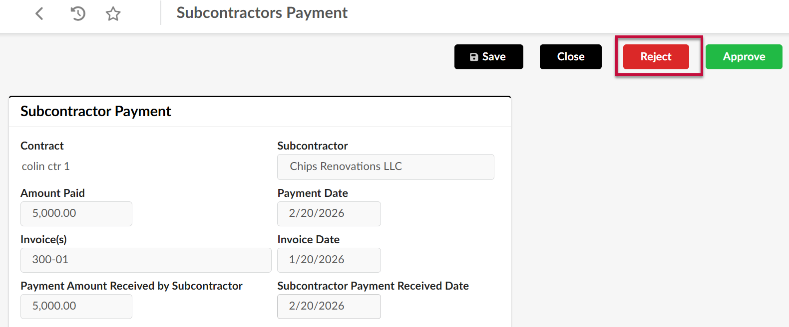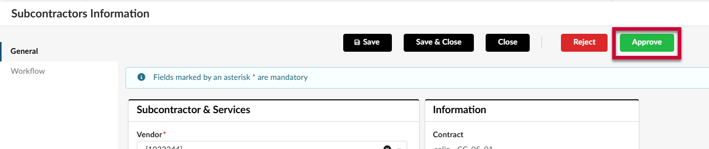 - After reviewing the information entered by the vendor, click Approve to add the subcontractor to the contract record.